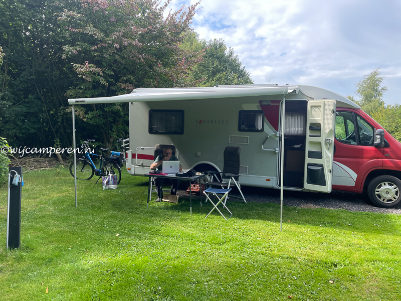 Wij hebben ons op donderdag geïnstalleerd, zo hadden we een lekker lang weekend. Op de vrijdag kwam eerst jongste kleinzoon. Toen onze oudste kleinkinderen hier lucht van kregen kwamen ze ook even langs. En zo hebben ze elkaar een hele poos vermaakt. Ook zijn we lekker met z’n allen gaan eten op het terras van de Camperplek.